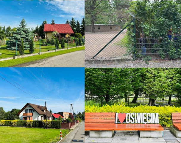 Left two: pictures of houses in Oświęcim, Poland, June 2025