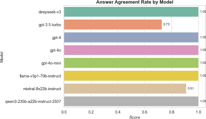 Figure 1: Answer Agreement Rate (AAR) by model, averaged across invariant prompt variations. Most models maintain perfect consistency; GPT-3.5-turbo and Mixtral show notable instability.
