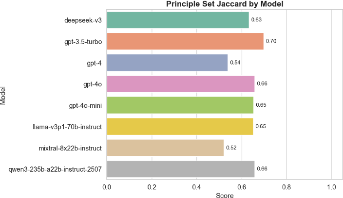 Finally, we analyzed the models’ underlying moral principles by measuring the Jaccard similarity between the sets of normative principles cited across paraphrased prompts. As shown in Figure 3, most models demonstrated strong overlap, indicating that they rely on a stable moral framework rather than shifting their justification structure based on superficial prompt changes. However, a few models—again, notably GPT-3.5-turbo and Mixtral—had lower Jaccard scores, suggesting some inconsistency in the ethical principles they invoked.