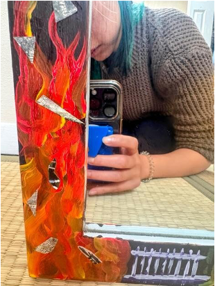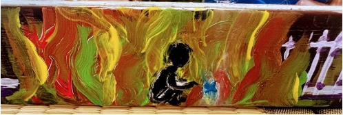 Bottom left: This fire represents anger or hatred, the motivation behind many killings. The tombstones memorialize those lost; there are also shoes, disconnected from their bodies but connected to their shadows. This represents the experience of walking through Auschwitz, seeing piles upon piles of hair, suitcases, eyeglasses, and shoes. They are only objects but their shadows, their ghosts, subsist. They were once connected to bodies.