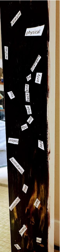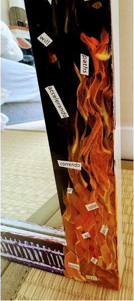 Bottom right: This fire represents desire or greed, as well as the use of logical rationalizations to justify that desire or greed. The panel depicts the 1933 book burning by Nazi university students. By burning or banning literature, scholars put forward one ideology at the expense of other perspectives and help to create conditions for tyranny. The words also represent our desire to hide behind research papers on the path towards doing nothing. We use words to rationalize, to hide our greedy motives behind loftier goals. Among the words and phrases rising from the flames are “nuance,” “quotidiano,” and “you will look back and be (only) strangers.” The last of these is a nod to how quickly we become strangers to remembering.