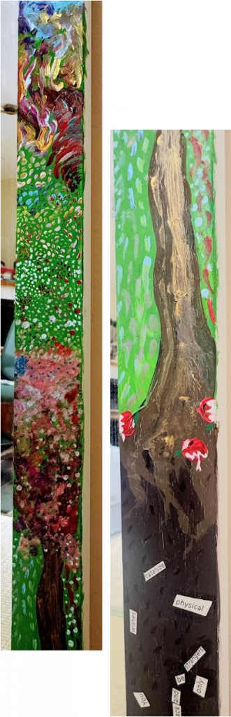 Top left: The flying crane represents peace and healing. The picnic table, which contains the same purple hues as the railroad, represents a different use of the same material (wood). At the Brandenburg Euthanasia Centre, a propaganda video provided rationalizations for killing nearly 10,000 disabled patients, showing people with disabilities eating lunch on a picnic table on a sunny day. The voice-over narration stressed how they were a burden on the rest of society and therefore unworthy of life. Yet in the video, we can see smiles on the patients’ faces. With other eyes, we might feel glad that our finances and efforts go towards supporting people with disabilities, who deserve our care. The discrepancy between the ominous voice-over and the smiles in the video shows how easily we can wander, seeing the care for our patients as a burden rather than a joy. The children placed by the picnic benches serve as a memorial to the children who lost their lives in the concentration camps. In Michal Rovner’s permanent exhibition “Traces of Life,” the artist copies fragments of children’s sketches during the Holocaust onto the walls of a room in Block 27 of Auschwitz-Birkenau. Their drawings are remembered, but the children deserved so much more: to play, to dance, to grow up.